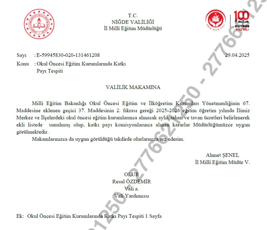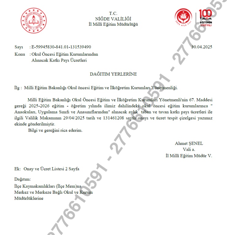 2025/2026 Eğitim/Öğretim Yılı Valilik Makamınca alınan karar doğrultusunda okul öncesi aylık katkı payı ücret çizelgesi aşağıdaki fotoğraflarda (yeşil boyalı) sunulmuştur. Velilerimizin bilgisine sunulur.